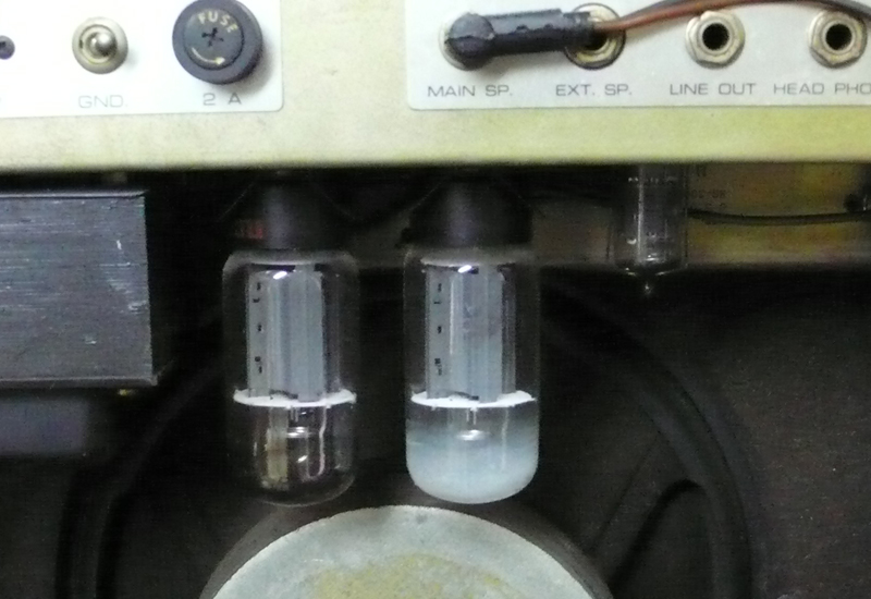 左側の真空管は、下半分が黒っぽく濁っている。