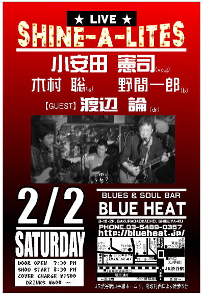 最近、富みに飲む機会が増えた旧友小安田憲司さん率いる Shine-A-Lites のライブが2月2日(土曜日)に渋谷のBLUE HEATで行われます。