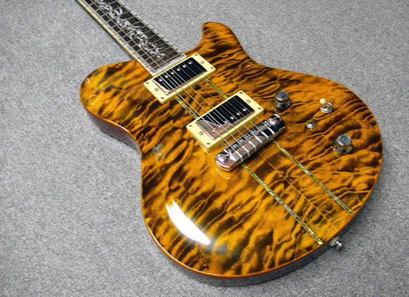 ボディは、キルトメイプルのアーチドトップでマホガニーバック