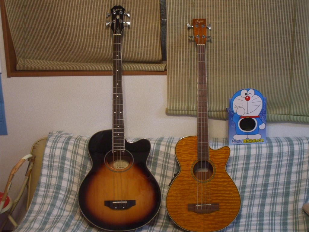 画像では、わかりにくいですが実物はかなりデカイです。フルサイズのボディーにロングスケールのネックで、立って弾くのはかなり辛いかもしれませんが、いつか、のライブでアンプラグドタイムが実現する時は活躍してくれるでしょう。